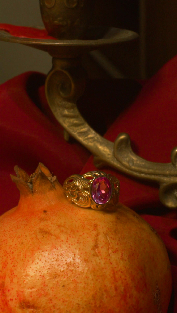 Chaque détail a été pensé pour capturer la magie d’un temps où le bijou était une déclaration d’amour et de raffinement. Les motifs dorés s’enlacent avec grâce, entourant le zircon rose comme un écrin précieux qui le met en valeur sous tous les angles.