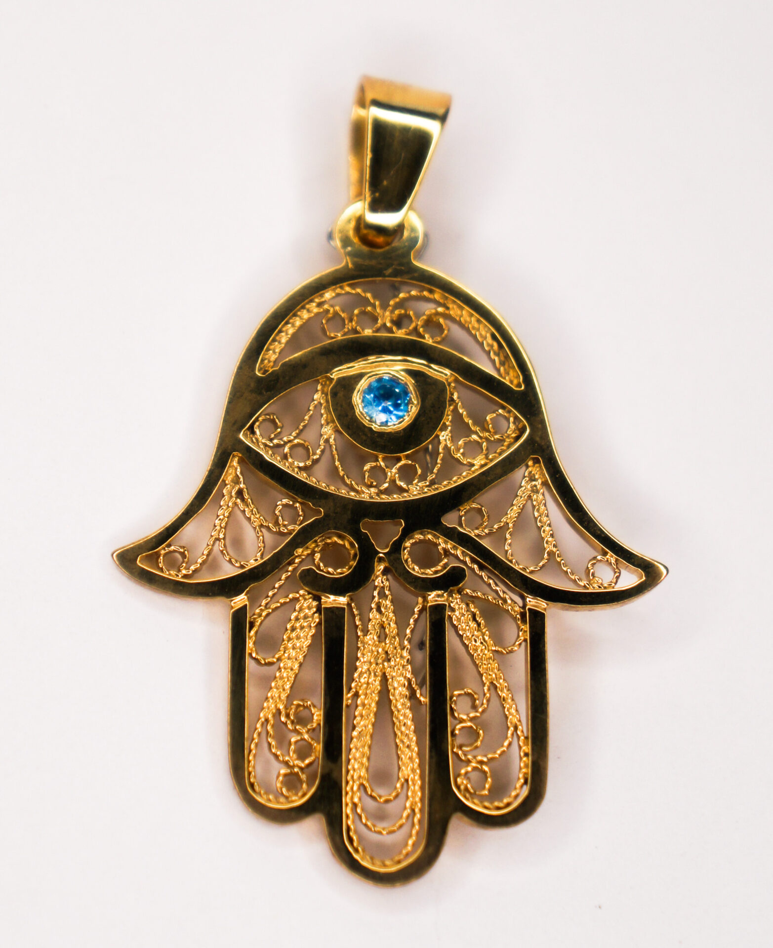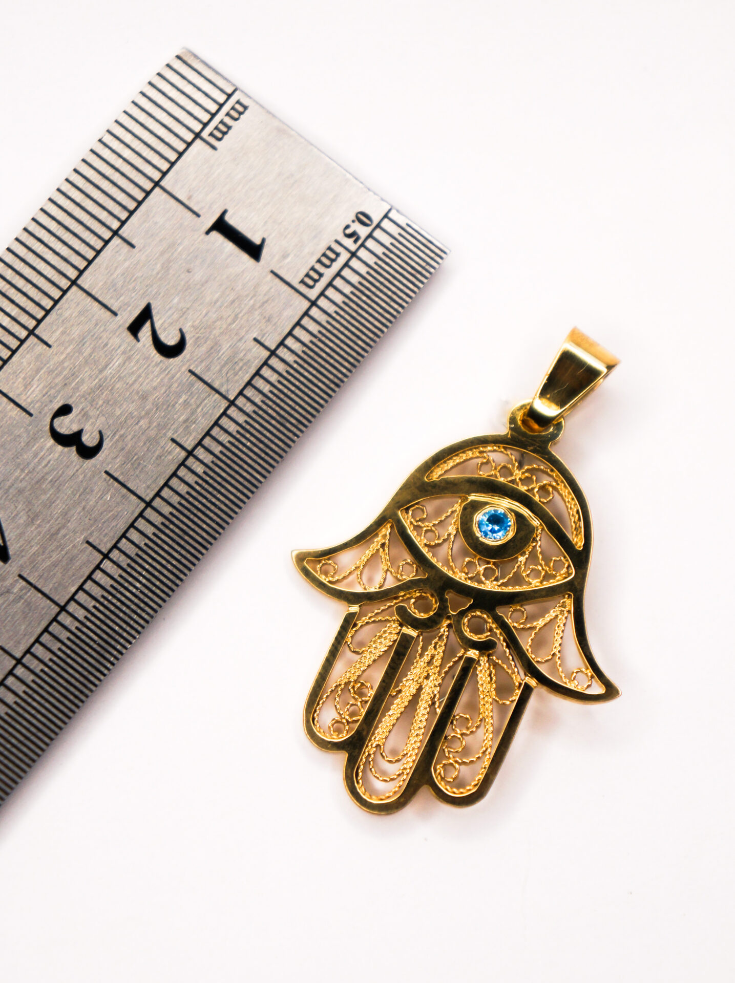 Pendentif Main de Fatma – Filigrane en Argent Plaqué Or 18 Carats & Zircon Bleu