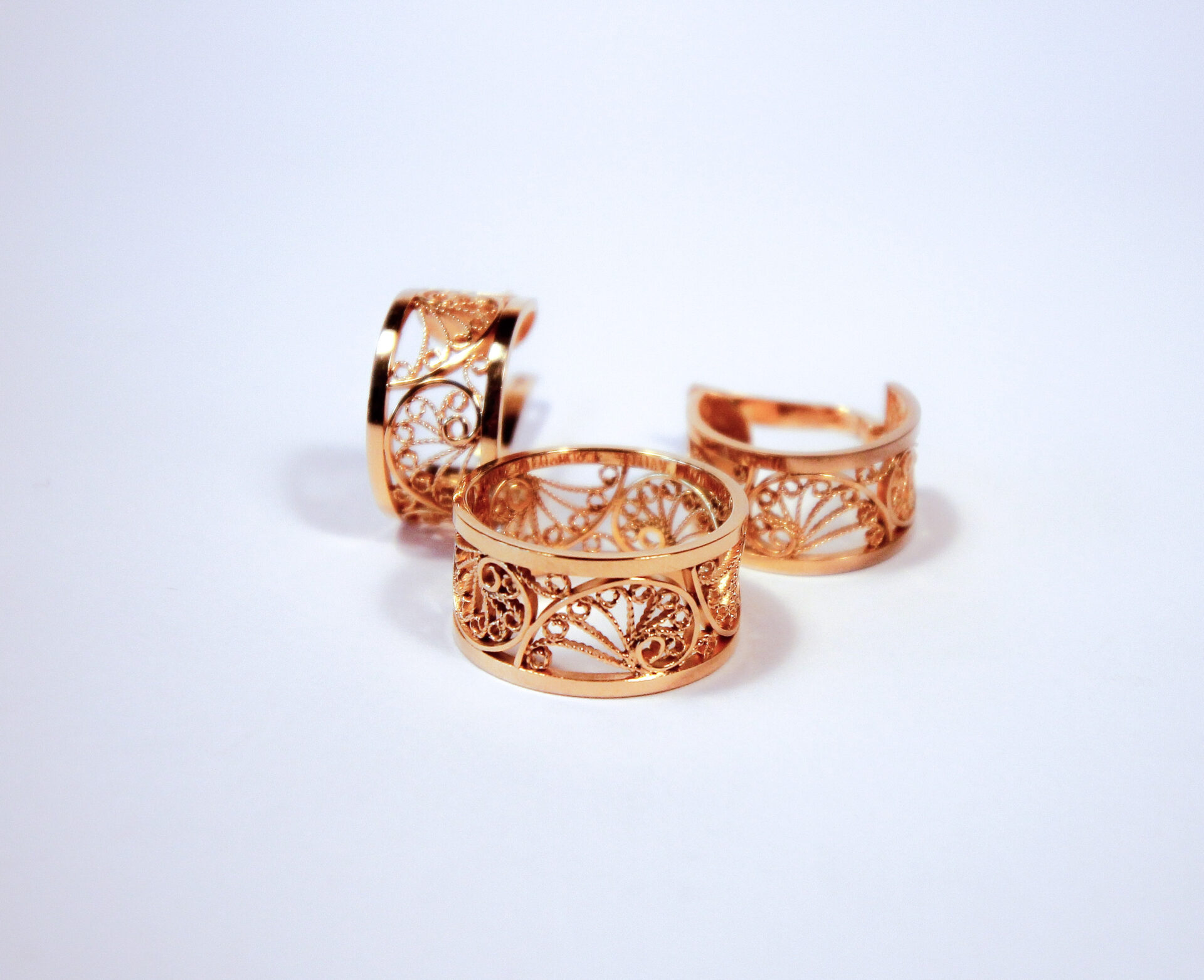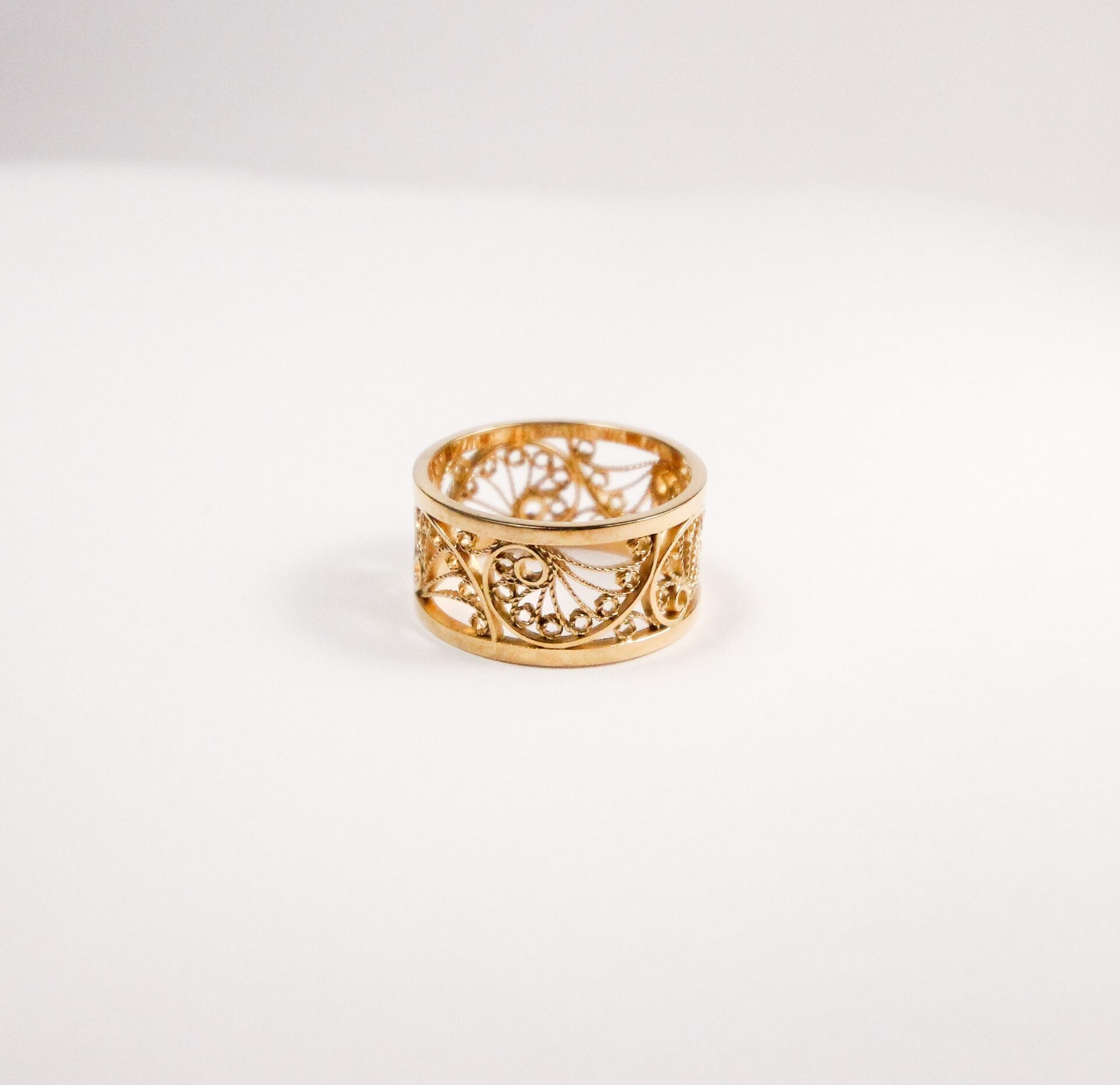 La technique du filigrane, travaillée avec finesse dans notre atelier, confère à ce bijou une légèreté visuelle presque irréelle. Les fils d’or, torsadés et soudés avec minutie, dessinent des arabesques délicates, des motifs qui semblent flotter sur la peau comme une dentelle précieuse.